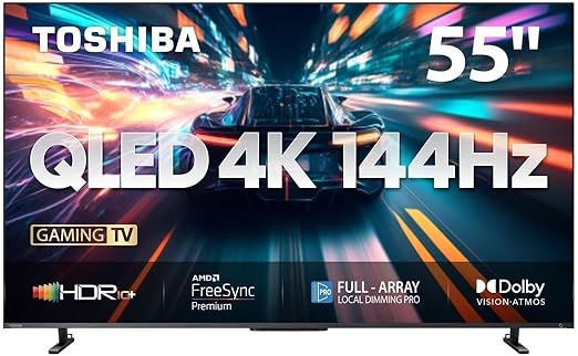 The Toshiba 75-inch 4K QLED Smart TV designed for an immersive viewing and gaming experience. It delivers lifelike colors and stunning clarity with over a billion shades thanks to Toshiba's QLED color technology combined with the REGZA Engine ZRi Gen3 AI processor, enhancing image sharpness, depth, and vividness. This model supports a native 144Hz refresh rate and gaming technologies like Variable Refresh Rate (VRR) and FreeSync Premium to minimize lag and screen tearing, making it ideal for fast-paced games. The Dolby Vision IQ HDR system dynamically adjusts to content and ambient light conditions for optimum picture quality.